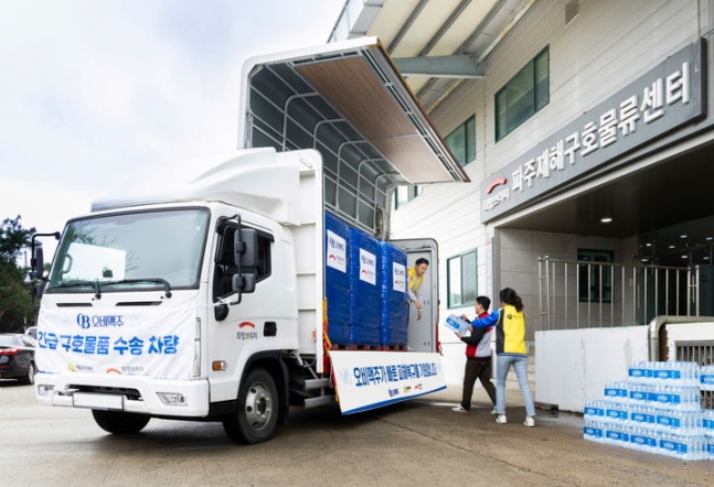 희망브리지 파주 물류센터에서 오비맥주가 기부한 생수를 수송 차량에 싣고 있다. /오비맥주 제공