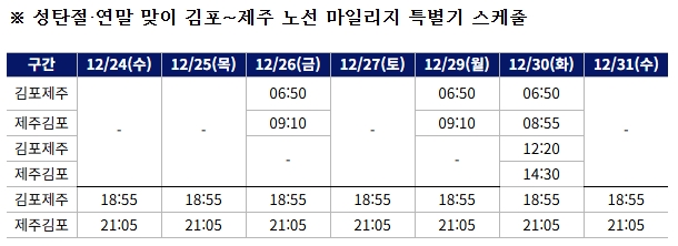 이번 마일리지 특별기는 크리스마스이브인 24일부터 김포~제주 노선 특정 시간대에 마일리지로 우선 발권이 가능하도록 마련됐다. 단, 28일은 운항하지 않는다.