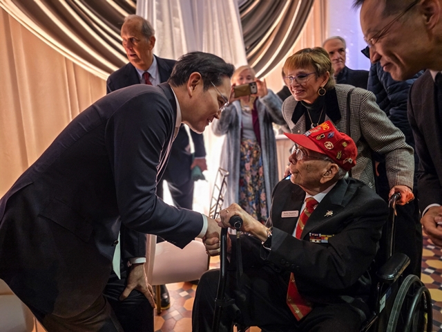 이재용 회장이 28일(현지시간) 미국 워싱턴 D.C. 스미스소니언 예술산업관에서 열린 갈라 디너에서 6·25 참전용사를 만나 대화하고 있다. /삼성 제공