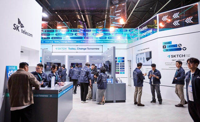SKT가 MWC26 부대행사 ‘4YFN’에서 AI 및 ESG 분야 혁신 스타트업들과 함께 ‘SKT 스타트업 단독 전시관’을 운영하고 있다. /SK텔레콤 제공