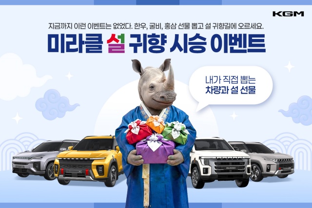 KG모빌리티(KGM)는 설 명절을 맞아 귀성·귀향길 차량을 제공하는 ‘미라클 설 귀향 시승 이벤트’를 실시한다고 26일 밝혔다.이번 이벤트는 설 연휴 기..