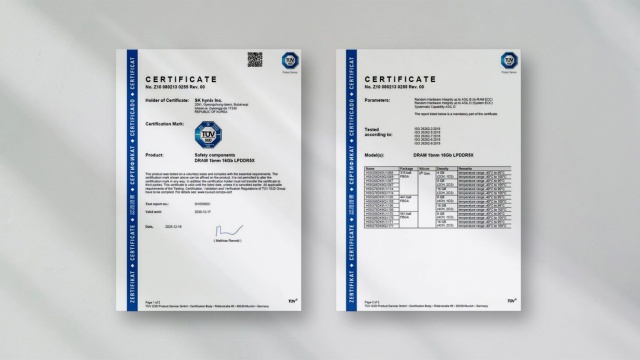SK하이닉스가 최신 LPDDR5X 차량용 D램 제품으로 자동차 기능 안전 국제표준 ISO 26262의 최고 안전 등급인 ASIL-D 인증을 획득했다.SK..