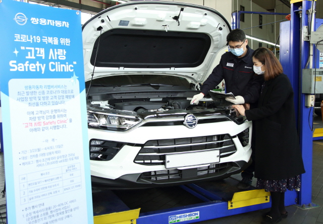 쌍용자동차가 코로나19 감염 예방 및 방지를 위해 '고객 사랑 세이프티 클리닉 차량점검 서비스’를 실시한다고 23일 밝혔다. 코로나19 예방 캠페인 ..