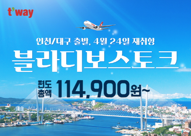 티웨이항공이 오는 4월 24일부터 인천과 대구에서 출발하는 러시아 블라디보스토크 노선 운항을 재개한다. 인천 출발(화, 금, 일)과 대구 출발(월, 수,..